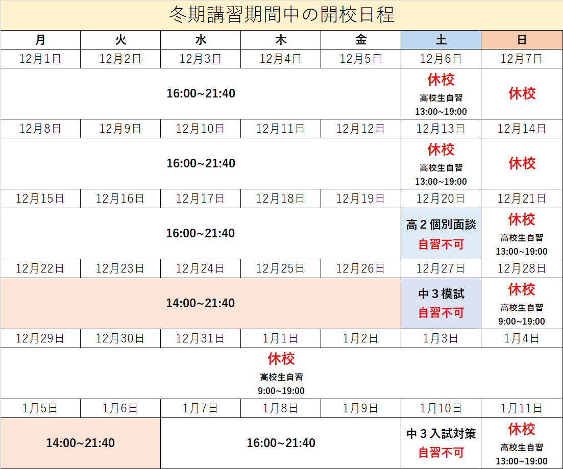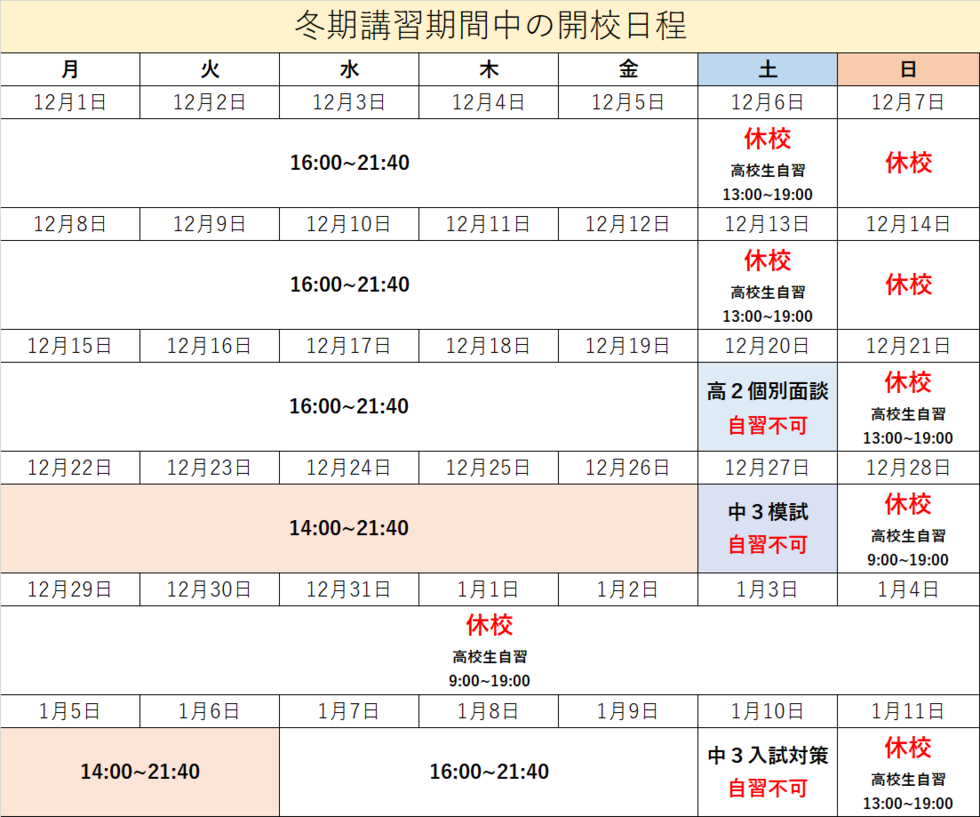 2025年冬期講習期間 開校時間
